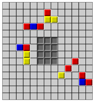 First, unlike the other tile games included in TileMania, the puzzle shapes are not all uniform in color. Some pieces are made up of yellow and blue tiles, others yellow and red. Second, you might have noticed a very bizzare looking piece in the lower right, which does not look like any other puzzle piece you've seen. That's right; you get to design your own shapes. Finally, if you were paying close attention, you might have said, "Hey, wait a minute! There are only twelve squares in the puzzle shape, but the total number of squares in the puzzle pieces is...sixteen??" That's right! The trick is, puzzle pieces can overlap, but only on identically colored tiles! Obviously, this introduces a whole new set of challenges into the game! |